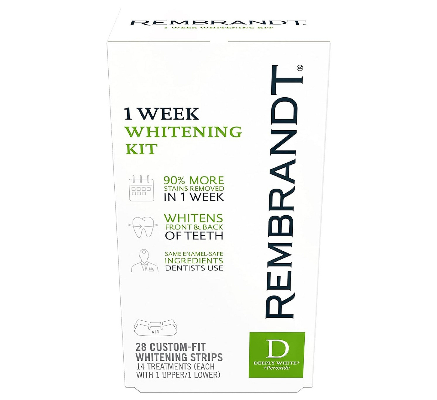 Almost all teeth-whitening products use the same active ingredient, hydrogen peroxide, because it’s effective. So, what makes the good ones stand out isn’t the formula—it’s the strip design. These ones from Rembrandt are it. The strips are large, they’re the same size for the top and bottom, and they cover the entire fronts and backs of your teeth. Why the backs? Natural teeth aren’t entirely opaque, so by erasing stains on both sides, your teeth get whiter quicker. Keep it simple. LED lights aren’t necessary here.