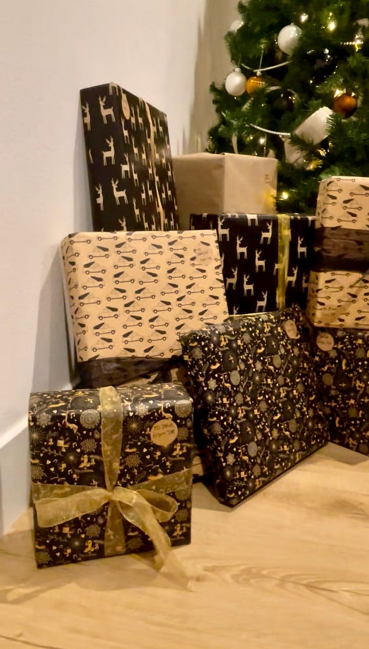 I tie roughly half the gifts with ribbon, and the rest I just neatly wrap, always securing with double-sided tape for a more seamless finish. And I use plain kraft gift tags.
