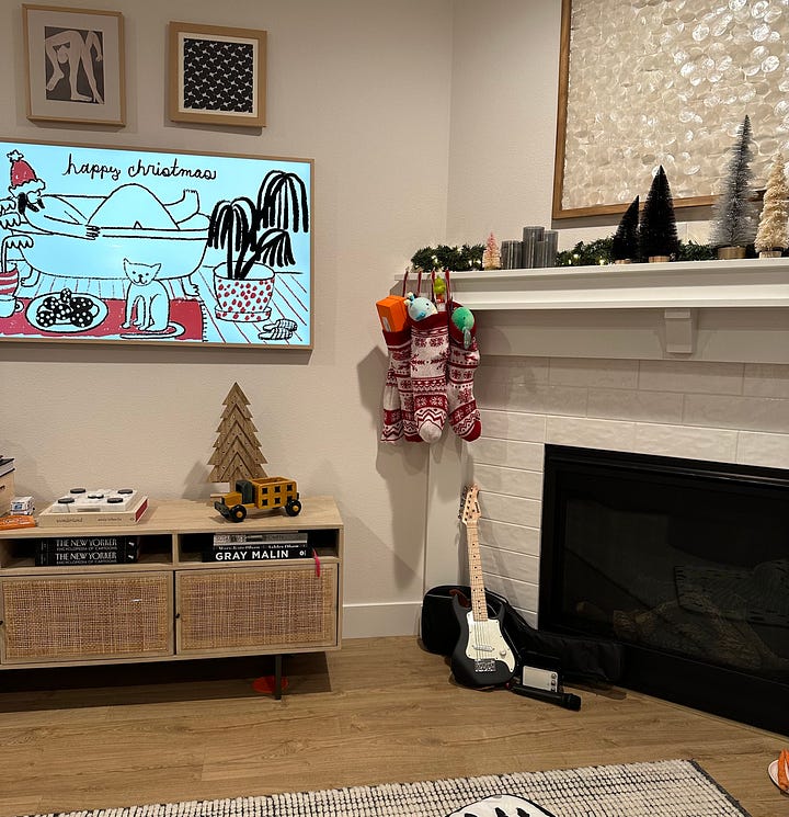 We unabashedly have TVs in many rooms, three of which are the Samsung Frame hung within a gallery wall (and professionally wired for a cord-free finish). I change the picture every month or so and like to have something festive up for the holidays.