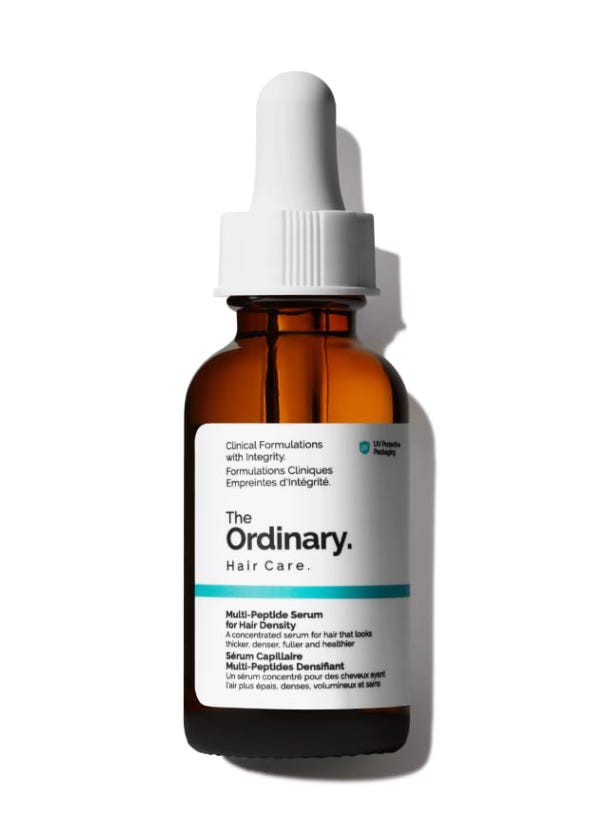 Then I’ll go in with some sort of scalp serum that stimulates blood circulation via caffeine. Vegamour Gro is a good one, but the tiny bottle is pricey. I also like The Ordinary’s Multi-Peptide Hair Serum. Again, this isn’t the be-all and end-all for hair growth—it’s just a little extra something.
