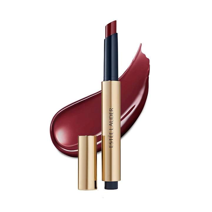 Go darker on your lips in the dark season. I’m into this plumping, balmy, semi-sheer lipstick from Estée Lauder. Neutrogena makes an affordable dupe.
