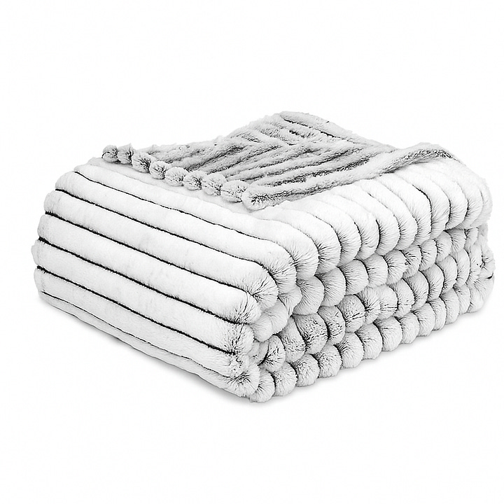 This Amazon blanket is under $25 but looks high-end. I have the white striped colorway—in person, it has a light-catching silvery finish.