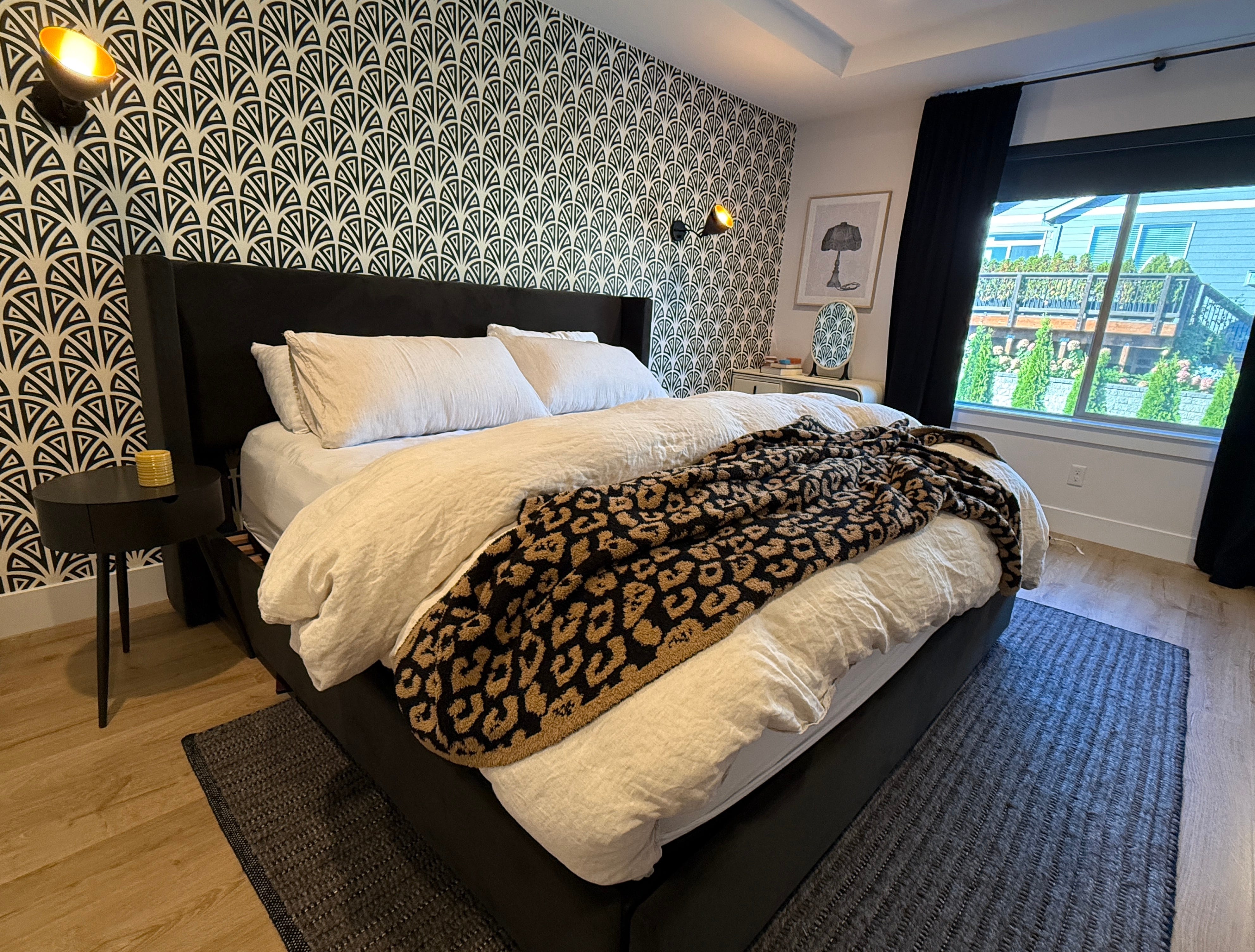 Believe in the power of blacking out your bedroom. We have not only dual blackout window coverings (roller shades covered by floor-length curtains) but also curved curtain rods that ensure every sliver of external light is covered.